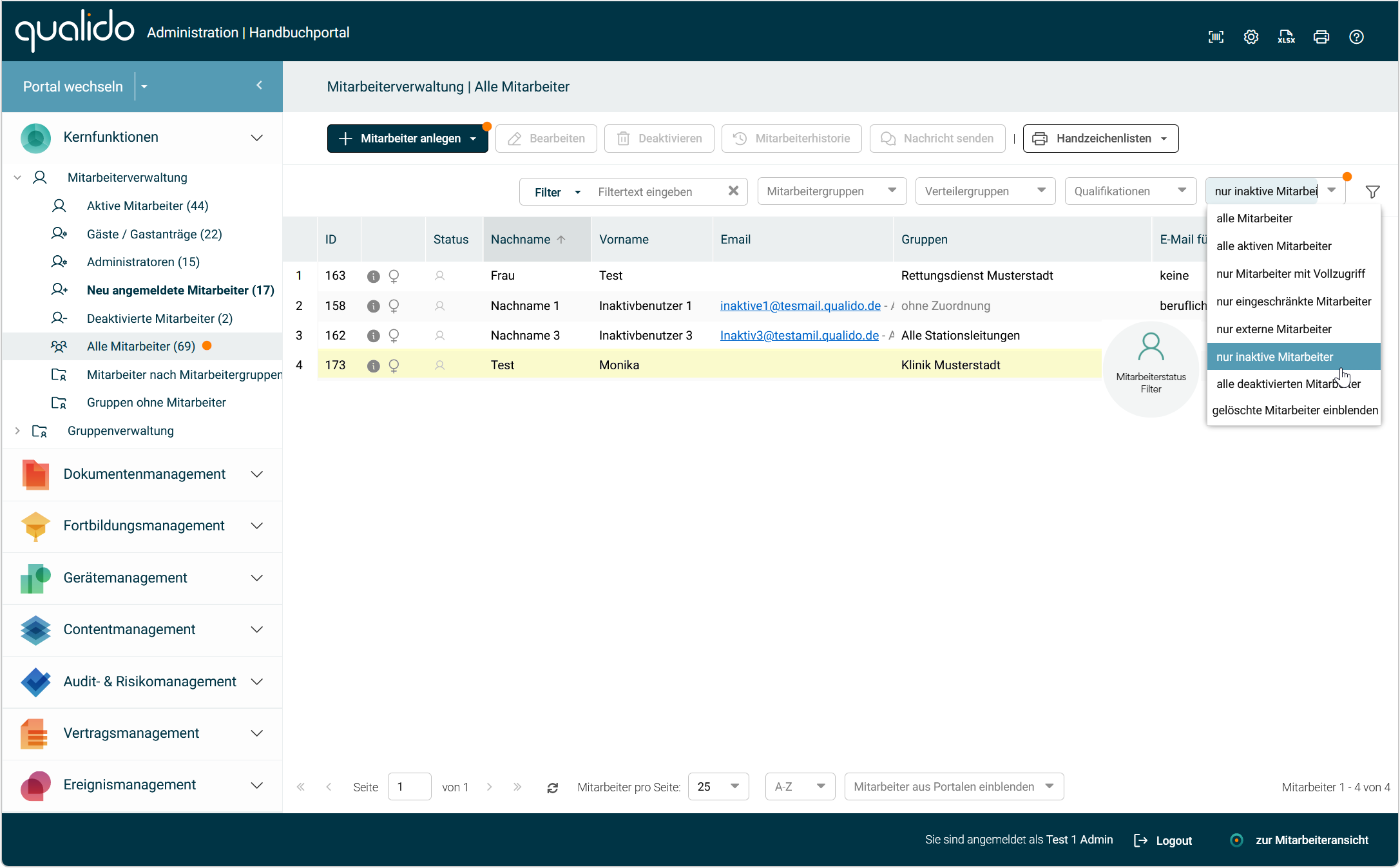 Die Darstellung der Liste mit gelöschten Mitarbeitern erfolgt über den Statusfilter unter allen Mitarbeitern und ist ausschließlich Administratoren mit dem Rechten Superadministrator oder dem DSGVO-Verantwortliche erlaubt.