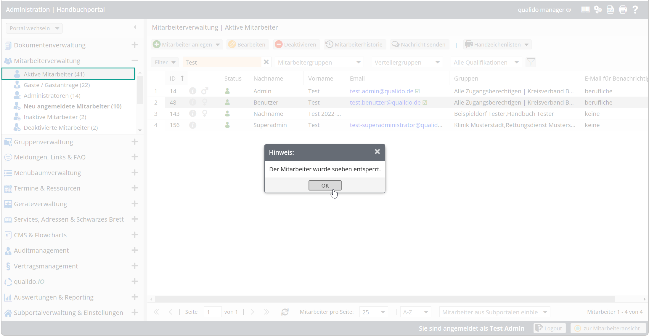 Portaladministratoren oder Administratoren mit dem Recht "Mitarbeiter verwalten", können die Kontosperrung des Mitarbeiters aufheben.