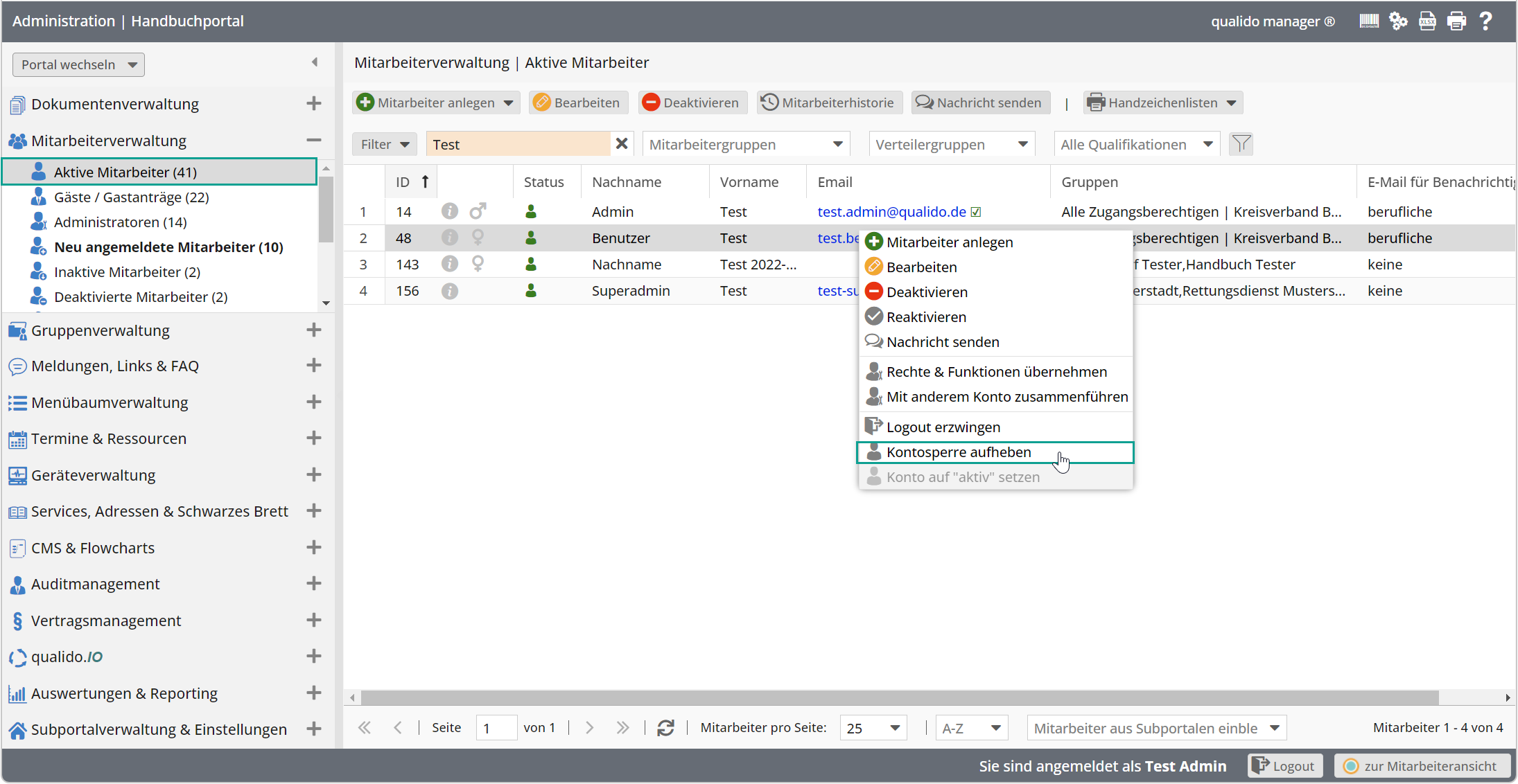 Wenn Sie die Kontosperrung des Mitarbeiters aufheben möchten, wählen Sie den Benutzer in der Mitarbeiterverwaltung aus und öffnen mit der rechten Maustaste das Kontextmenü. Über die Auswahl "Kontosperre aufheben" können Sie den Zugang wieder freischalten: