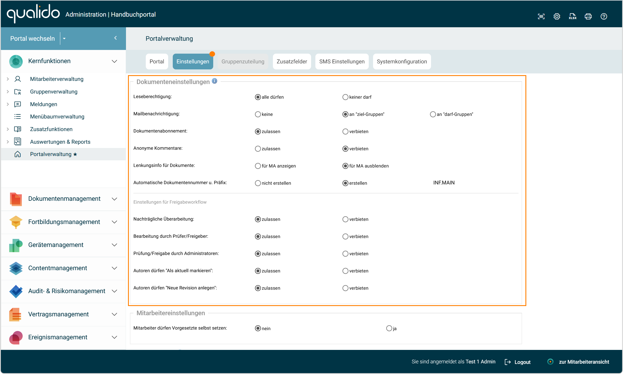 - Nur Administratoren: Nur Mitarbeiter mit Administrationsrechten dürfen dieses Portal betreten. Diese Einstellung kann z.B. in einer Start- oder Aufbauphase sinnvoll sein.