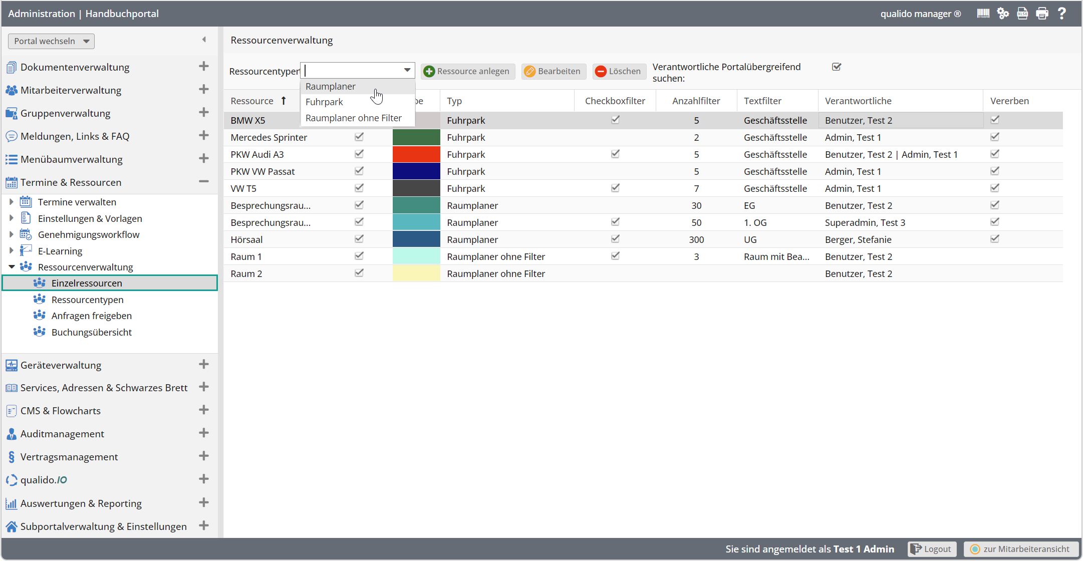 Für jeden Ressourcentyp können beliebig viele Einzelressourcen angelegt und bearbeitet werden. Es stehen Ressourcentypen-Auswahlfilter und die "Verantwortliche Portalübergreifend suchen" Option zur Verfügung, mit denen Sie eine Eingrenzung des Einzelressourcenüberblicks vornehmen können.
